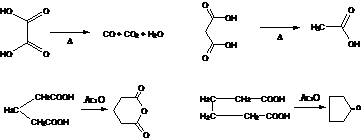 9. Blanc Reaction-(Effect of heat on dicarboxylic acids):-Dicarboxylic acids on heating with acetic anhydride gives either cyclic anhydrides or ketones depending on the respective positions of the carboxyl groups. 1,4- and 1,5-diacids yield anhydrides, while diacids in which the carboxy groups are in 1,6 positions yield ketones. (Note :- 1,2 or 1,3 dicarboxylic acids dissociate to form CO+CO2 and acetic acid respectively.)