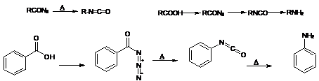 14. Curtius Rearrangement :-AcidAzides on by thermal decomposition gives isocyanates: The isocyanates on hydrolysis gives primary amines with one lesser carbin. The stepwise conversion of a carboxylic acid to an amine having one fewer carbon unit, via the azide and isocyanate, is referred to as the Curtius reaction: