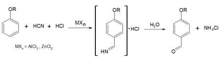 25. Gattermann Aldehyde Synthesis:-Preparation of phenolic aldehydes, phenol ethers or heterocyclic compounds by treatment of the benzene or aromatic substrate with hydrogen cyanide and hydrogen chloride in the presence of Lewis acid catalysts: