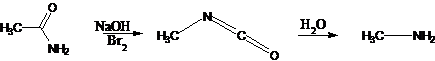 33. Hofmann Reaction-Conversion of primary carboxylic amides to primary amines with one fewer carbon atom upon treatment with hypohalites or hydroxide via the intermediate isocyanate: