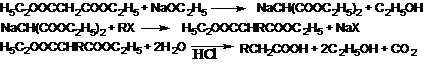 40. Malonic Ester Syntheses-Syntheses based on the strongly activated methylene group of malonic esters which on reaction with sodium ethoxide form a resonance-stabilized ion that can be alkylated or acylated. After hydrolysis, the free alkylmalonic acids readily decarboxylate to mono- or disubstituted monocarboxylic acids: