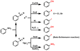 50. Sandmeyer Reaction;-Substitution of diazonium groups in aromatic compounds by halo or cyano groups in the presence of cuprous salts (Sandmeyer reaction), copper powder and hydrochloric or hydrobromic acid (Gattermann reaction) or cupric salts (Körner-Contardi reaction):
