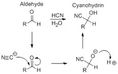 59. Urech Cyanohydrin Method; Cyanohydrin formation by addition of alkali cyanide to the carbonyl group in the presence of acetic acid (Urech method) or by reaction of the carbonyl compound with anhydrous hydrogen cyanide in the presence of a basic catalyst (Ultee cyanohydrin method):